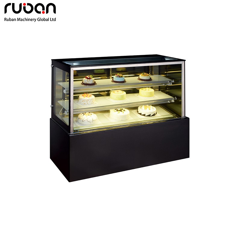 This commercial cake display refrigerator features a four-sided double-glazed design for excellent insulation and display, dynamic cooling with axial ventilator for uniform temperature and minimal moisture loss, and adjustable toughened glass shelves with energy-saving LED lighting. It includes a Danfoss compressor option and operates at 2~10℃, making it ideal for bakery shops.