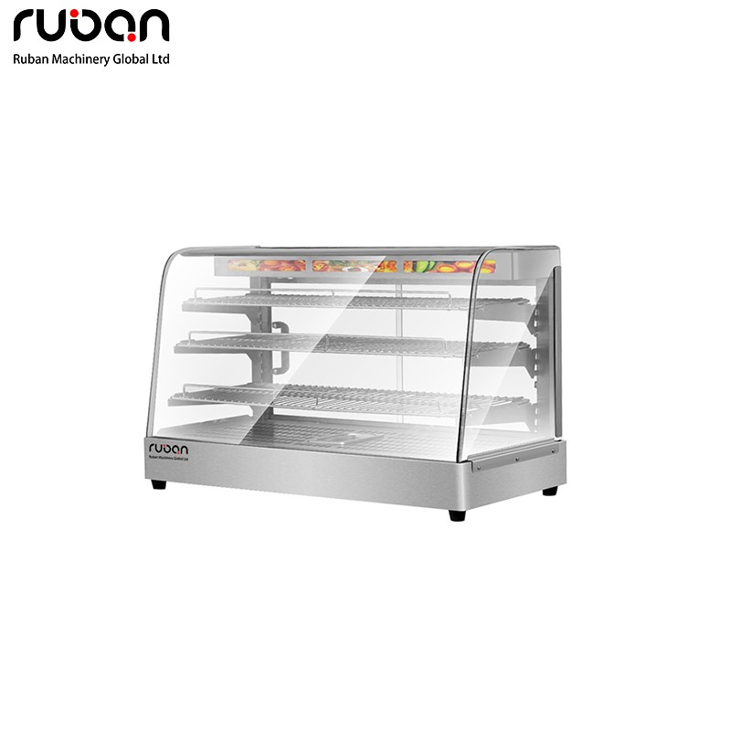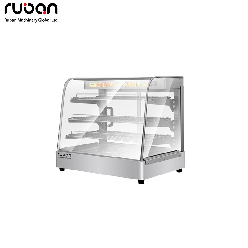 This commercial countertop food warmer features a curved glass display for eye-catching food presentation. With adjustable temperature control, internal lighting, and removable wire shelves, it keeps food at ideal serving temperatures, perfect for cafes, fast food shops, and bakeries.