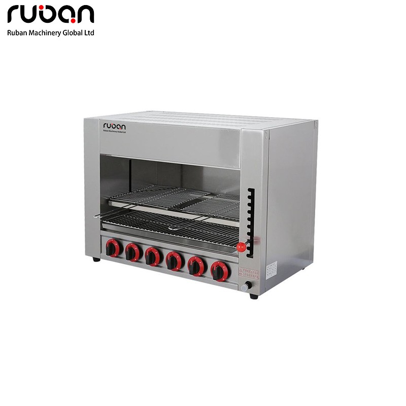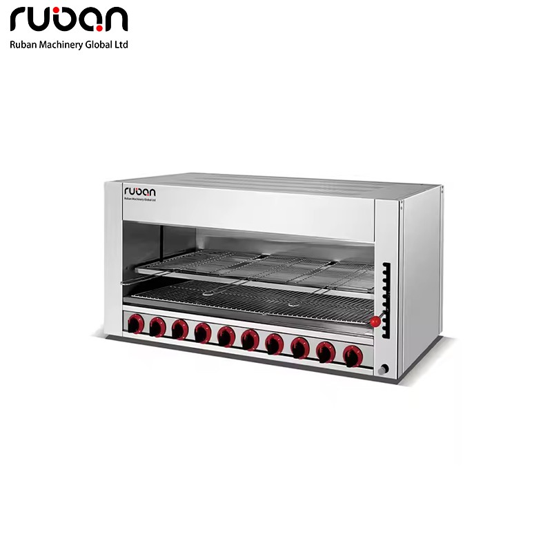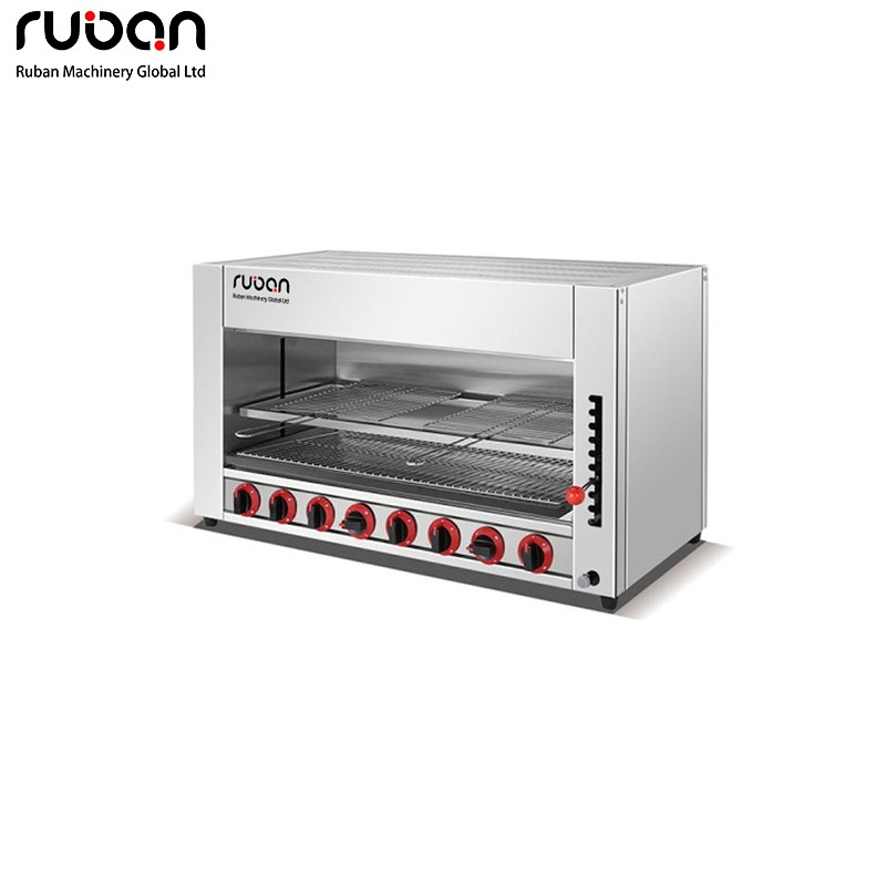 This heavy-duty commercial gas salamander grill is designed for high-heat professional cooking. Crafted from durable stainless steel, it features multiple independent burners, adjustable height, and dual heat controls for precise searing, melting, and browning. Ideal for restaurants, hotels, and food service, supporting both LPG and NG gas sources.