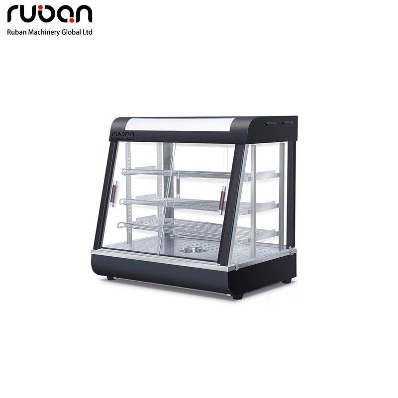 This commercial food warmer showcase features automatic thermostat & humidity control, adjustable stainless steel shelves, and sliding front/back doors for easy access. With internal lighting and visible temperature gauge, it keeps food hot and fresh, ideal for cafes, restaurants, food stalls, and bakeries.