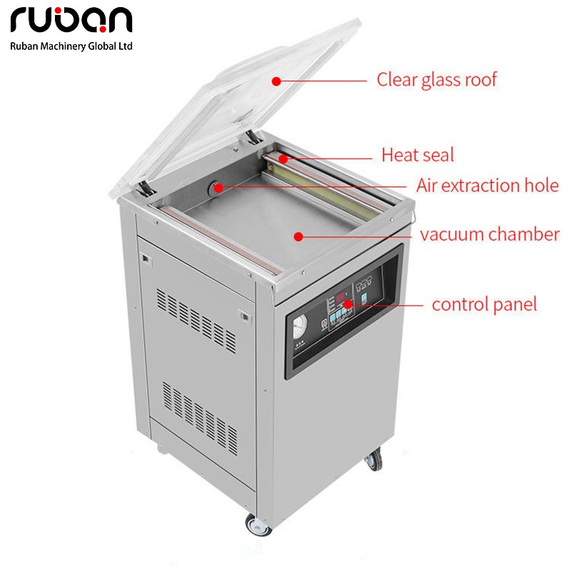 2. Working principle: Put the items to be packaged into a vacuum bag and place it in the vacuum chamber, start the equipment through the operation panel, first extract the air in the vacuum chamber to the set vacuum degree, then start the heat sealing device to complete the sealing, so as to realize the vacuum-sealed packaging of the items.
