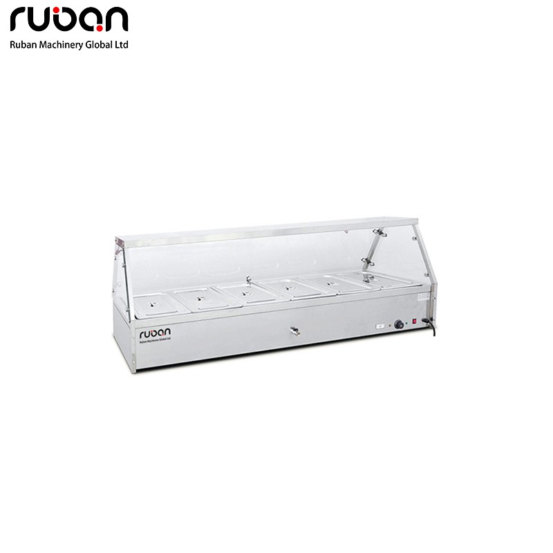 This commercial electric bain marie features durable stainless steel and a curved glass sneeze guard for hygienic food display. With a precise adjustable thermostat and convenient drain faucet, it keeps food at ideal serving temperatures easily. Available in 3/4/5/6 pan sizes, perfect for restaurants, buffets, and catering.