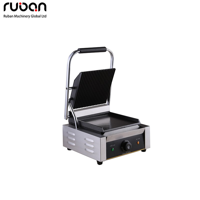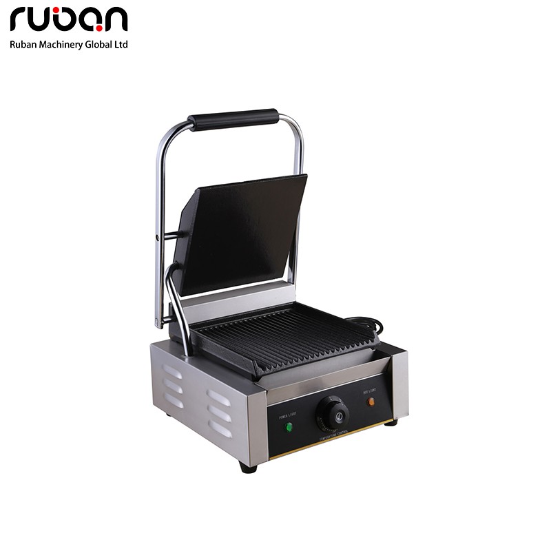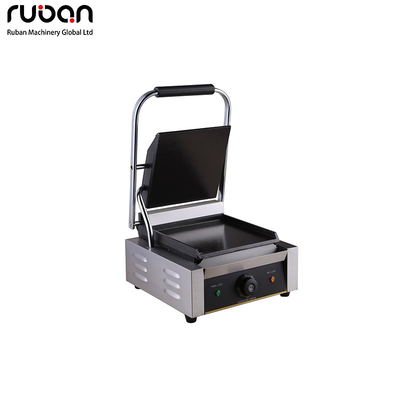 This commercial electric panini press features a durable stainless steel frame and heavy-duty cast-iron grooved plates. Equipped with a single precision temperature control knob and indicator lights, it ensures even heat distribution for perfectly searing paninis, burgers, steaks, and sandwiches. Its compact countertop design and easy-to-clean structure make it an essential cooking station for restaurants, cafes, food trucks, and catering businesses.