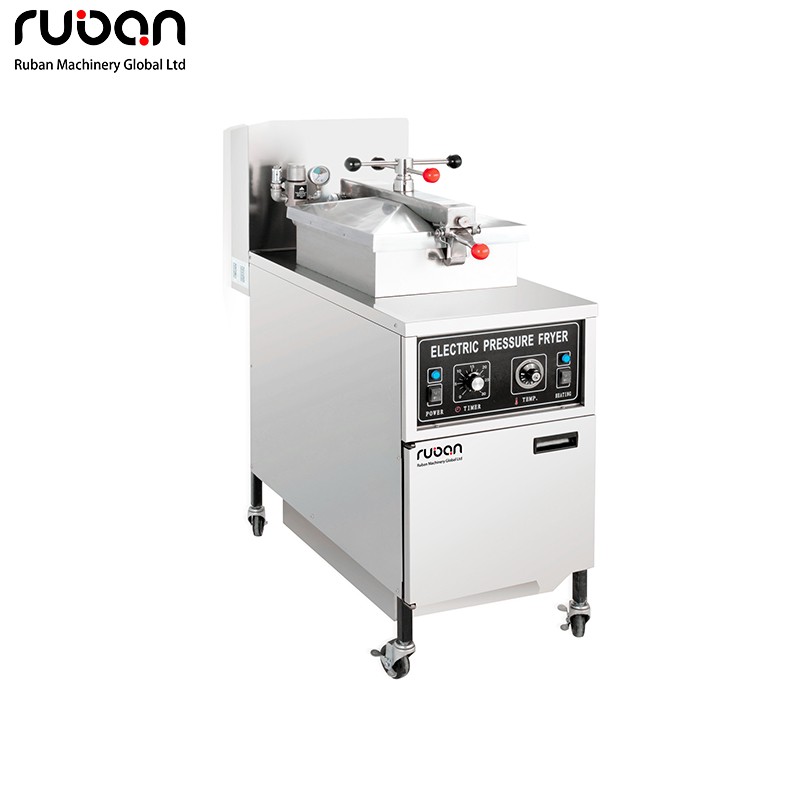 Commercial standing floor pressure fryer, aluminum lid, sturdy and easy to operate. Equipped with brake casters for mobility, overpressure safety device, electric timing and thermal overload protection. Reliable oil drain valve, ideal for fried chicken shops and restaurants.