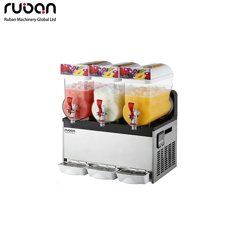 This slush machine is available in single-cylinder, double-cylinder and triple-cylinder models. Its body is mainly made of stainless steel, paired with a transparent PC material storage cylinder equipped with red dispensing valves for intuitive and convenient operation. The equipment is equipped with an independent refrigeration system and imported compressors, featuring high cooling efficiency that can produce slush within 30-45 minutes. It adopts an electromagnetic magnetic transmission structure, with low operating noise and a long service life. The tank is resistant to high and low temperatures, easy to disassemble and clean. The whole machine is easy to move and maintain, and is suitable for making slush, smoothies and other drinks in commercial places such as milk tea shops, internet cafes and restaurants.