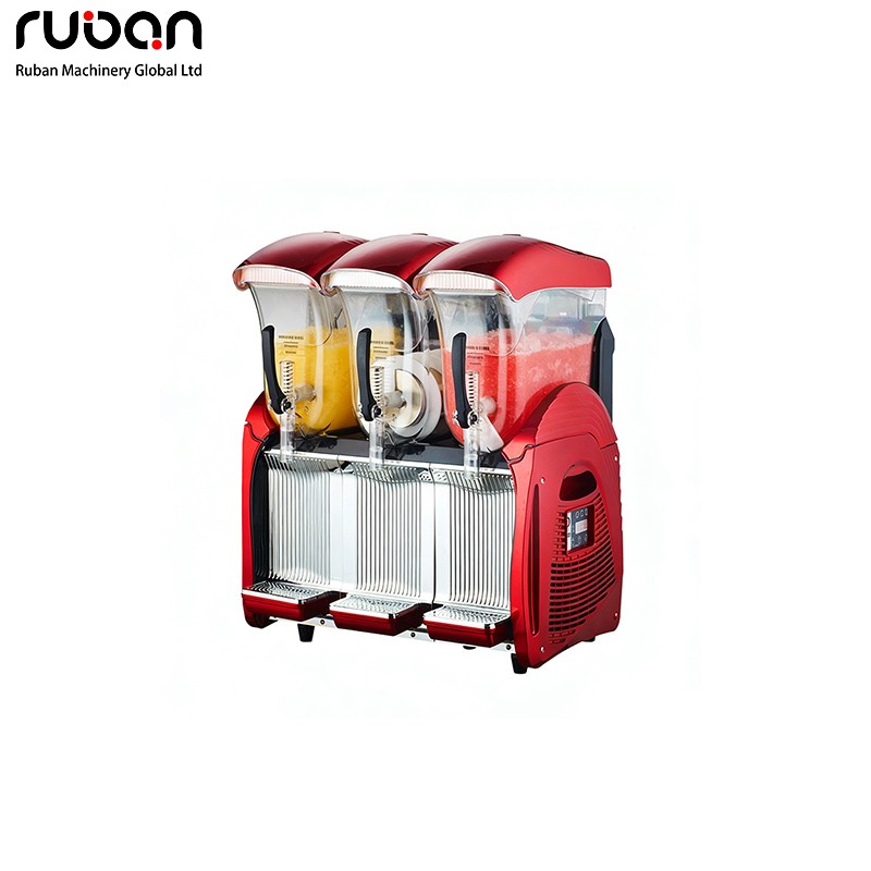 This slush machine is available in single-cylinder, double-cylinder and triple-cylinder models. Its body is mainly made of stainless steel, paired with a transparent PC material storage cylinder equipped with red dispensing valves for intuitive and convenient operation. The equipment is equipped with an independent refrigeration system and imported compressors, featuring high cooling efficiency that can produce slush within 30-45 minutes. It adopts an electromagnetic magnetic transmission structure, with low operating noise and a long service life. The tank is resistant to high and low temperatures, easy to disassemble and clean. The whole machine is easy to move and maintain, and is suitable for making slush, smoothies and other drinks in commercial places such as milk tea shops, internet cafes and restaurants.