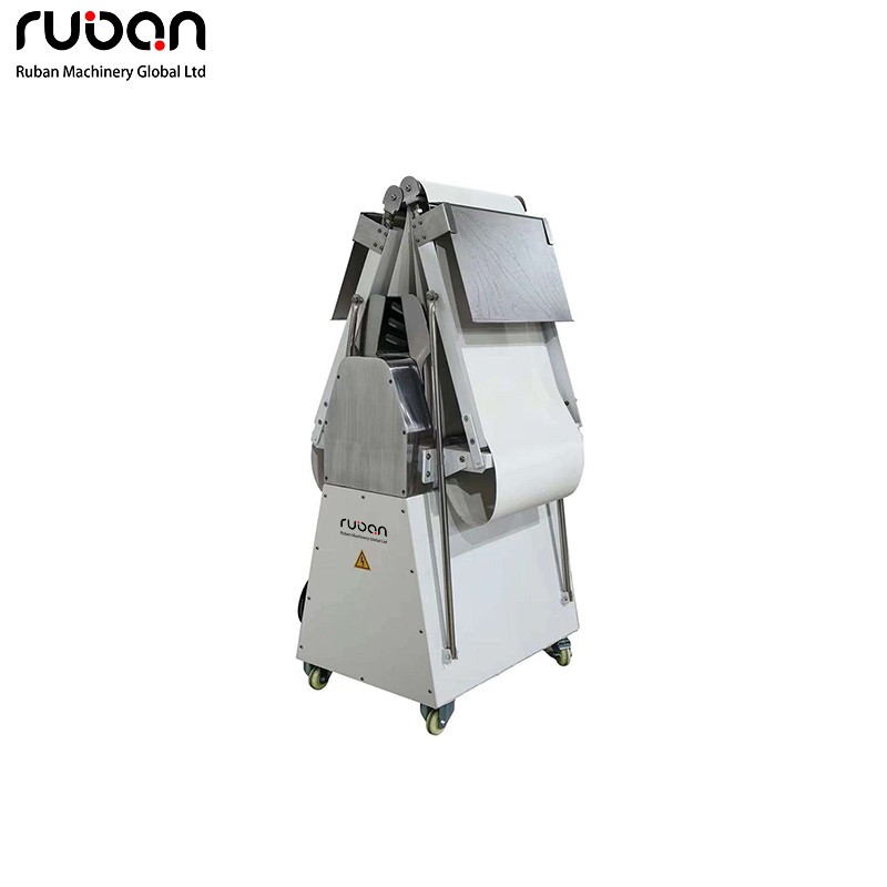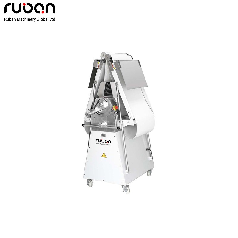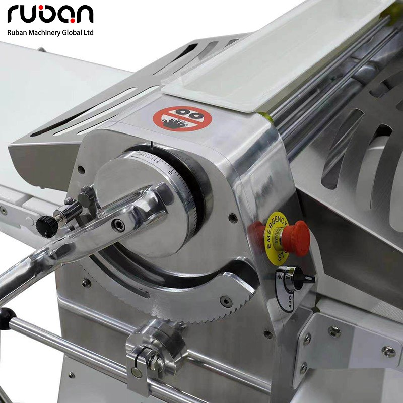 This commercial pastry laminator (dough sheeter) is a pro-grade appliance for bakeries and commercial kitchens, designed for efficient dough lamination and rolling. Made of food-grade metal for durability and hygiene, it has an adjustable rolling system for precise dough thickness control, producing uniform sheets for layered pastries like croissants and danishes.