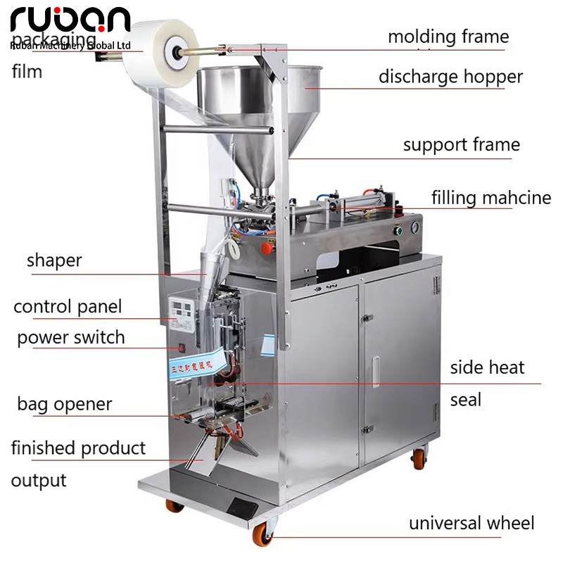 This sauce packaging machine is a fully automatic vertical liquid/paste packaging device. Its main body is made of stainless steel, equipped with a hopper, a roll film feeding system, a metering and filling assembly, and a sealing and cutting mechanism. With universal wheels at the bottom, it combines durability with mobility and flexibility, and can realize the integrated operation of sauce from quantitative filling to forming and sealing.