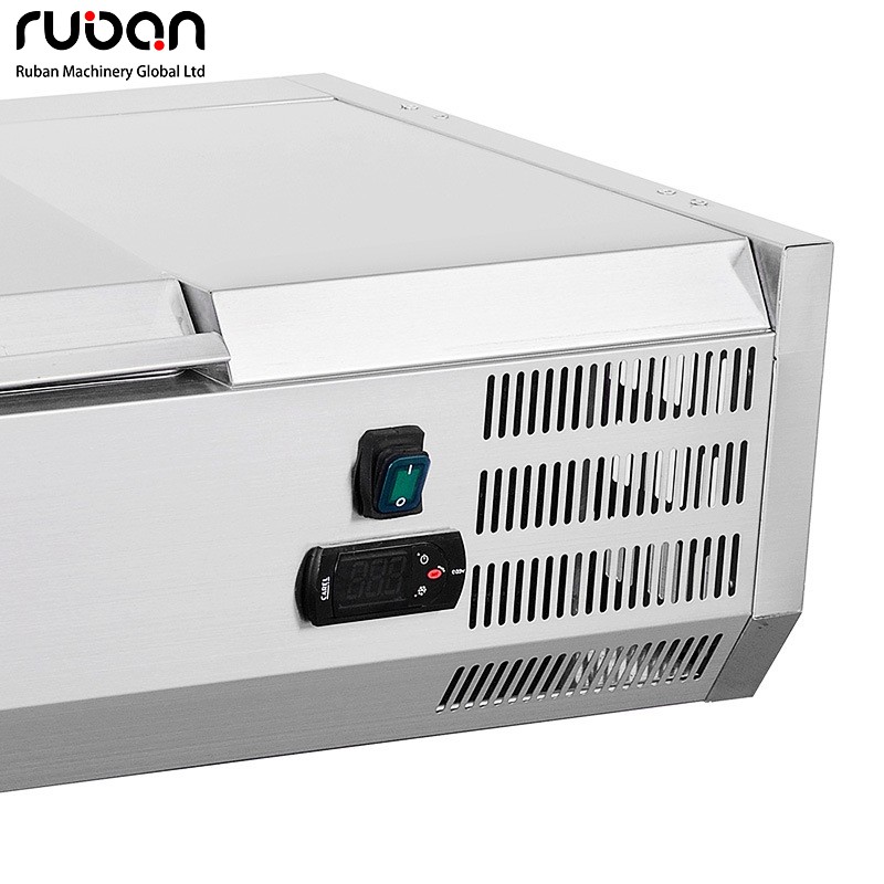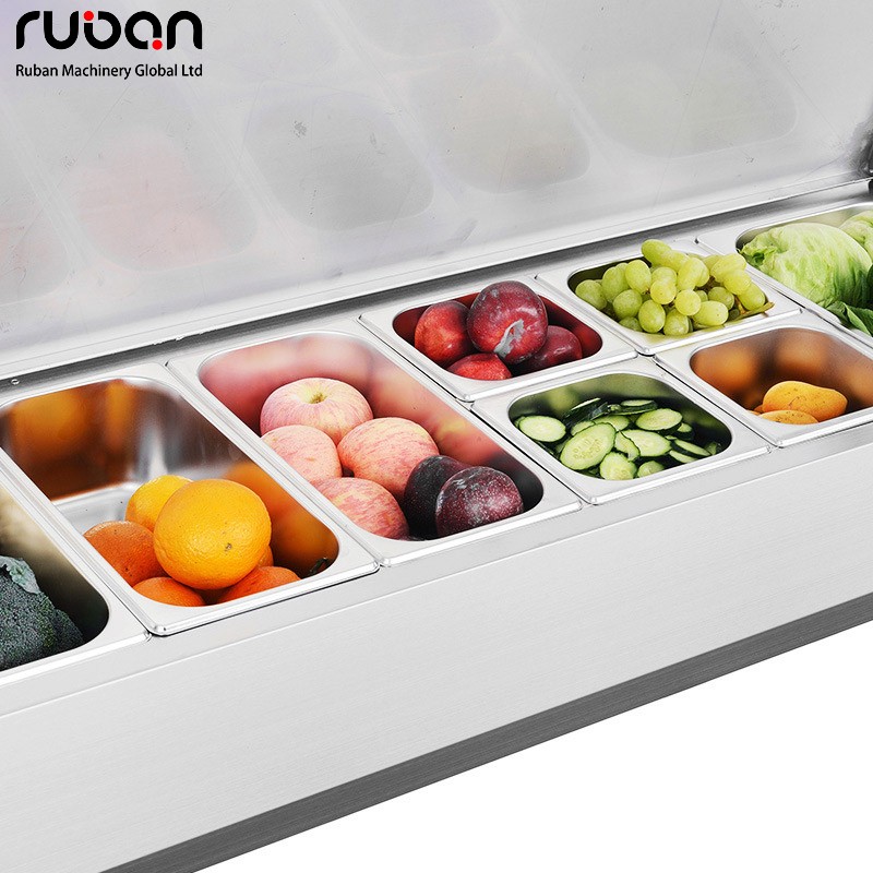 This desktop refrigerated salad ingredient station is a dedicated piece of equipment for commercial scenarios such as light food stores, western restaurants, and self-service restaurants. Crafted from food-grade stainless steel, it integrates the functions of ingredient refrigeration and fresh-keeping as well as classified storage. The equipment is equipped with multiple independent ingredient compartments, which can store salad ingredients like vegetables, fruits, and sauces separately. Paired with a flip-up sealed cover, it can not only prevent dust but also help retain cold air. Built with a precise refrigeration system, it provides a low-temperature fresh-keeping environment for ingredients. The temperature control panel and heat dissipation structure on the side ensure stable refrigeration. With a compact and small overall design, it is suitable for use in small spaces such as bars and worktops, serving as an efficient tool for salad preparation and ingredient prepping.