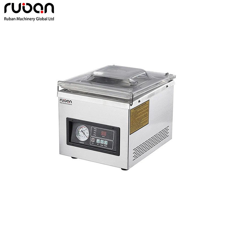 This desktop vacuum sealer is made of a stainless steel body, equipped with a transparent flip-top operation chamber and an intelligent control panel, and integrates a vacuum gauge pressure display and one-touch operation buttons. With a compact and small body design, it is specially designed for the vacuum-sealed packaging of various items and can realize the integrated operation of vacuum extraction and sealing.